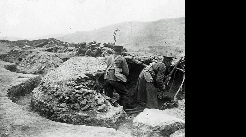 Infantry manning part of the 10th (Irish) Division's line on the Kosturino Ridge, December 1915.
